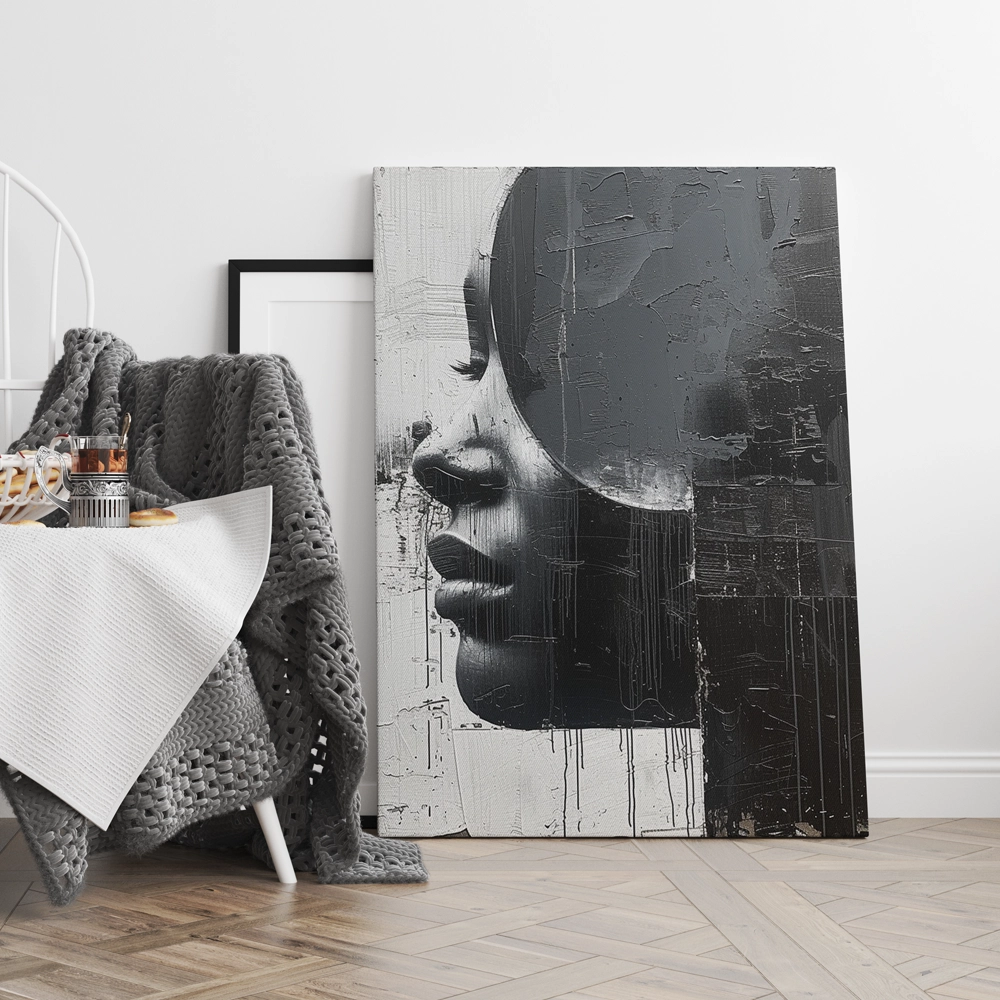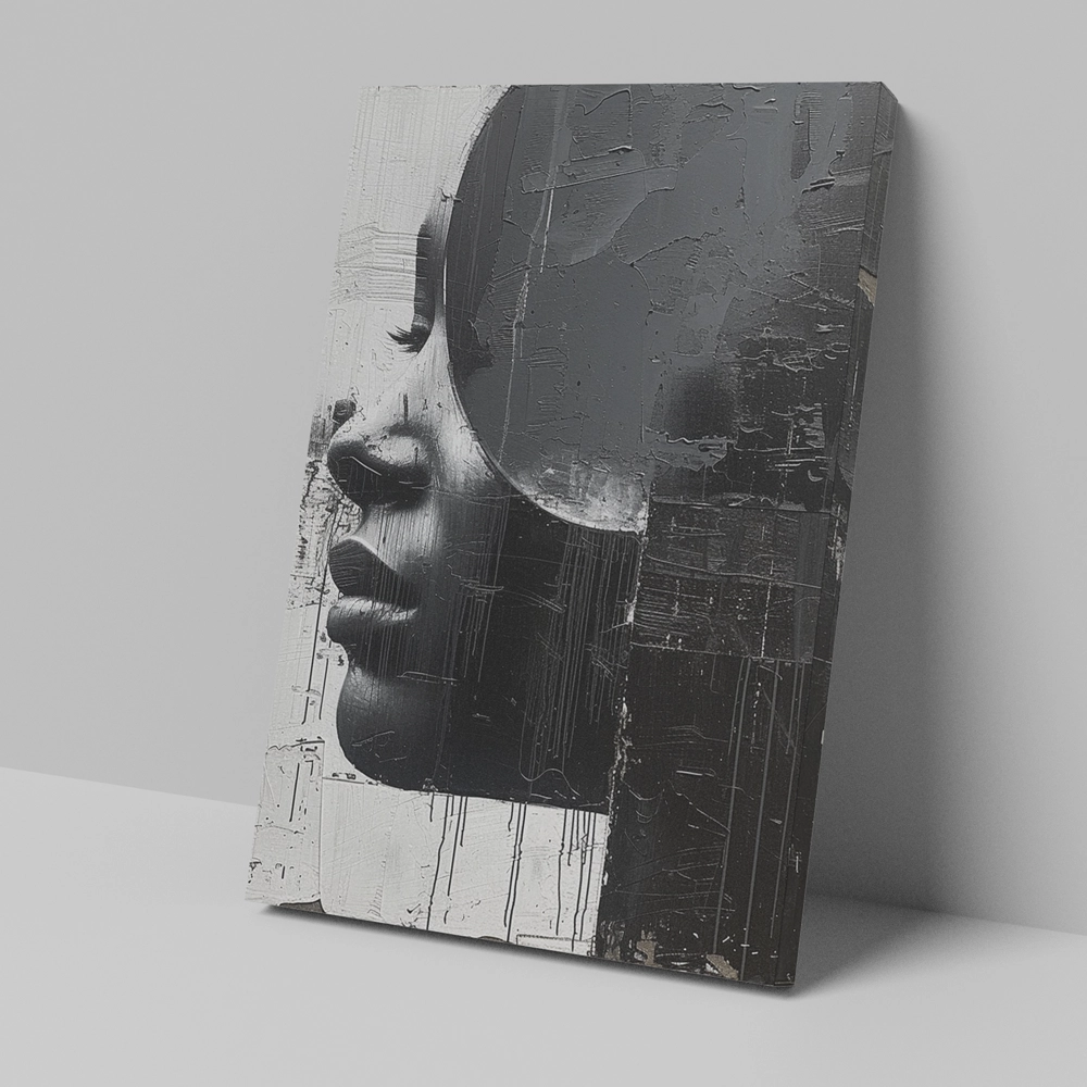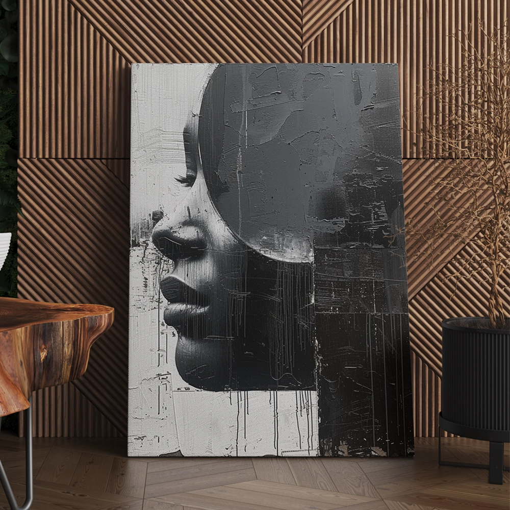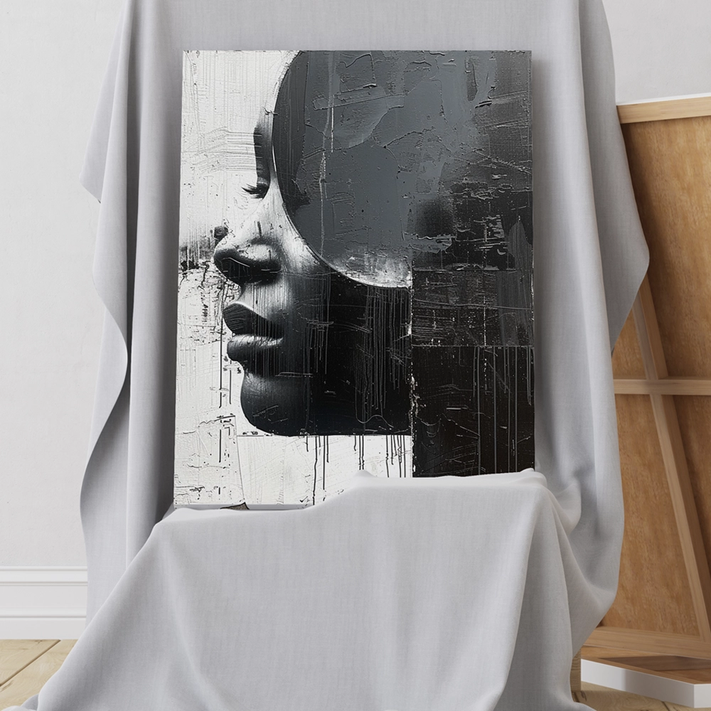 Transform your space with Monochrome Muse, a captivating black and white canvas wall art that merges portrait realism with abstract texture. The bold contrast and layered details give your walls a sense of drama and modern elegance.