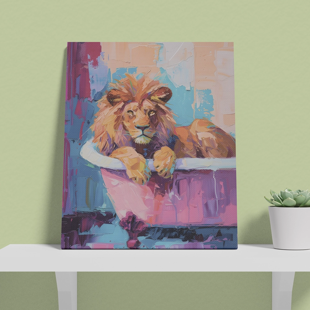 Transform your space with the bold elegance of the Royal Lion Retreat wall art. This stunning canvas captures a majestic lion lounging in a vintage bathtub, blending strength with a touch of playful luxury. The vibrant pastel tones and artistic brush strokes make it a standout piece that adds both power and charm to any room.