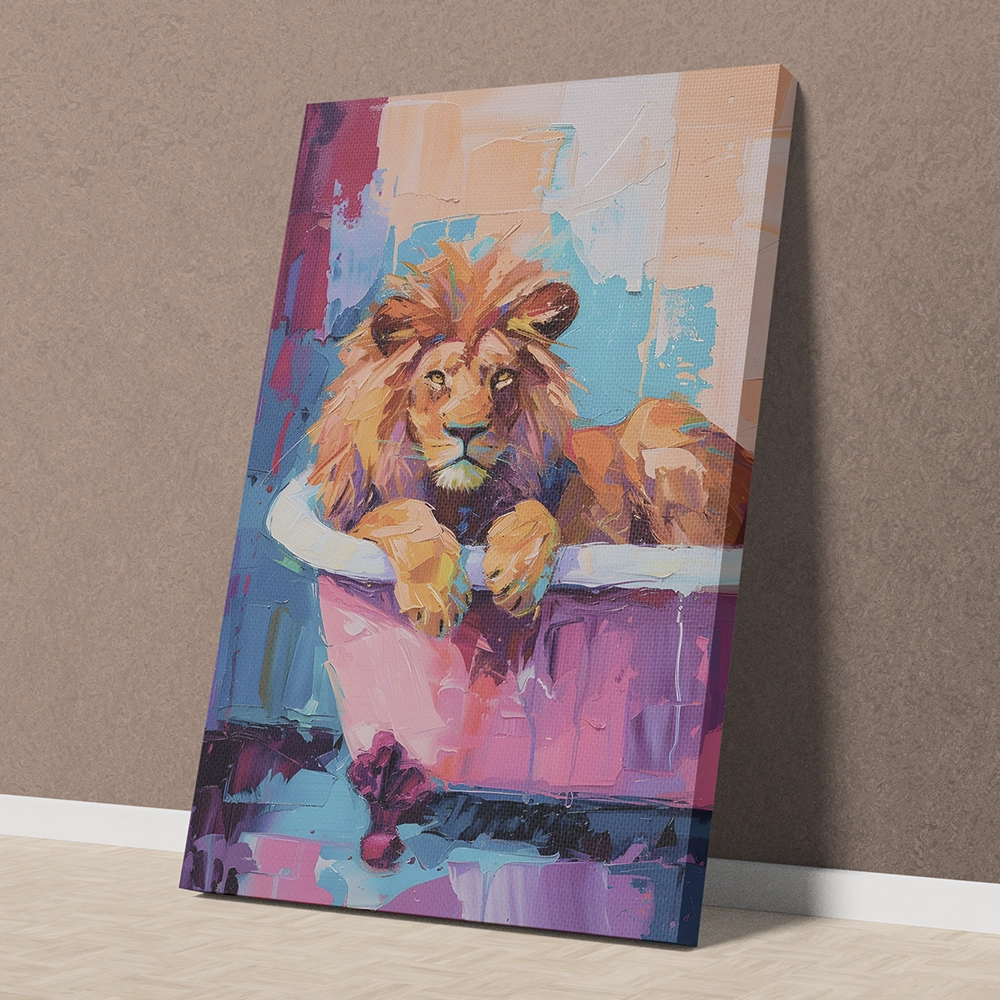 Transform your space with the bold elegance of the Royal Lion Retreat wall art. This stunning canvas captures a majestic lion lounging in a vintage bathtub, blending strength with a touch of playful luxury. The vibrant pastel tones and artistic brush strokes make it a standout piece that adds both power and charm to any room.