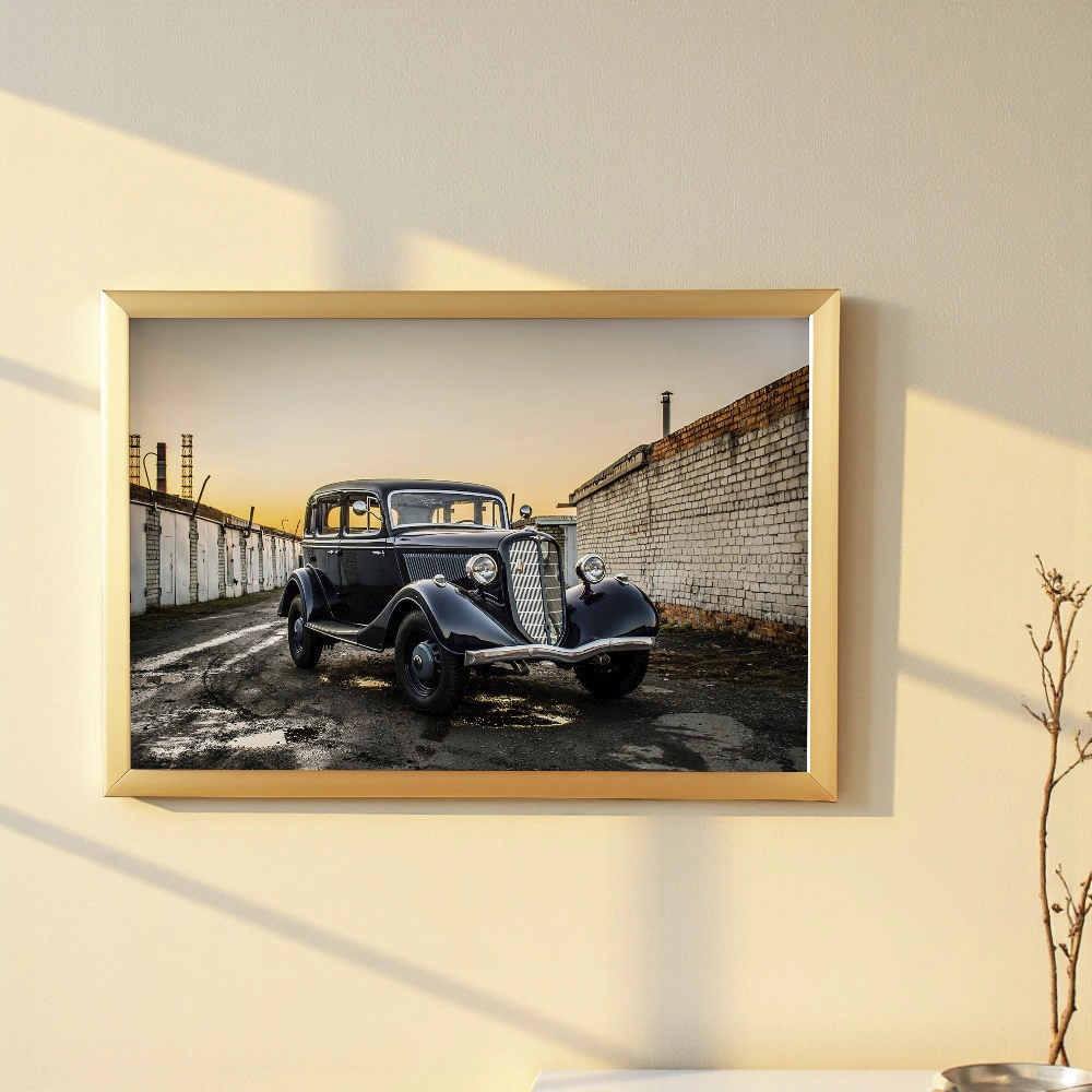 Bring timeless elegance to your home or office with Classic Vintage Car at Sunset, a stunning framed wall art piece that captures the beauty of automotive history. The image of a black vintage car parked along an old brick alley at golden hour creates a nostalgic and cinematic atmosphere. Printed on premium fine art paper and elegantly framed, this piece adds sophistication and character to any décor — perfect for car enthusiasts and lovers of classic design.