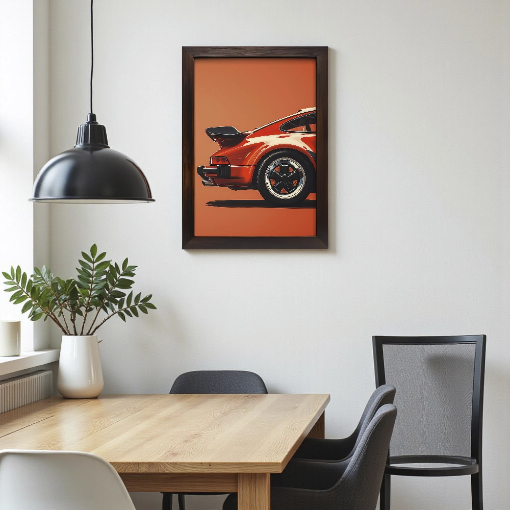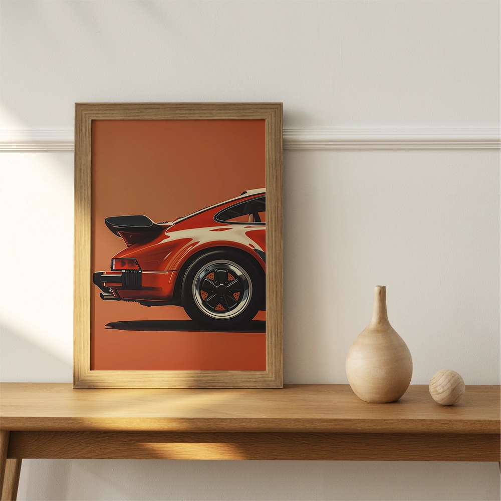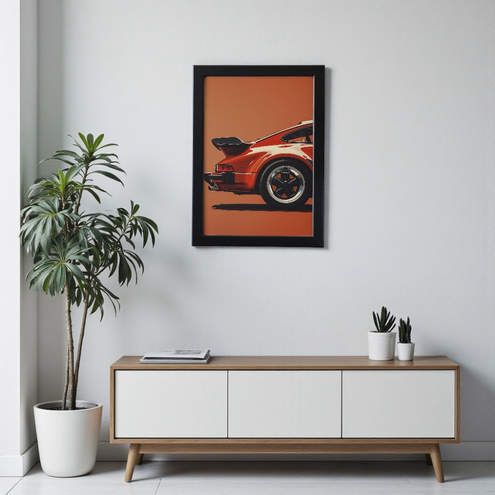 Add timeless speed and sophistication to your space with Crimson Turbo, a sleek celebration of automotive design and power. Featuring the rear profile of a classic red sports car set against a bold orange background, this artwork embodies precision, passion, and vintage allure. Printed on premium fine-art paper and framed with expert craftsmanship, Crimson Turbo makes a striking statement piece for car lovers, collectors, and modern interior spaces.