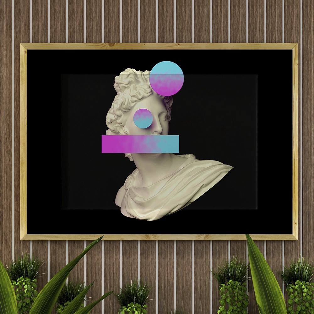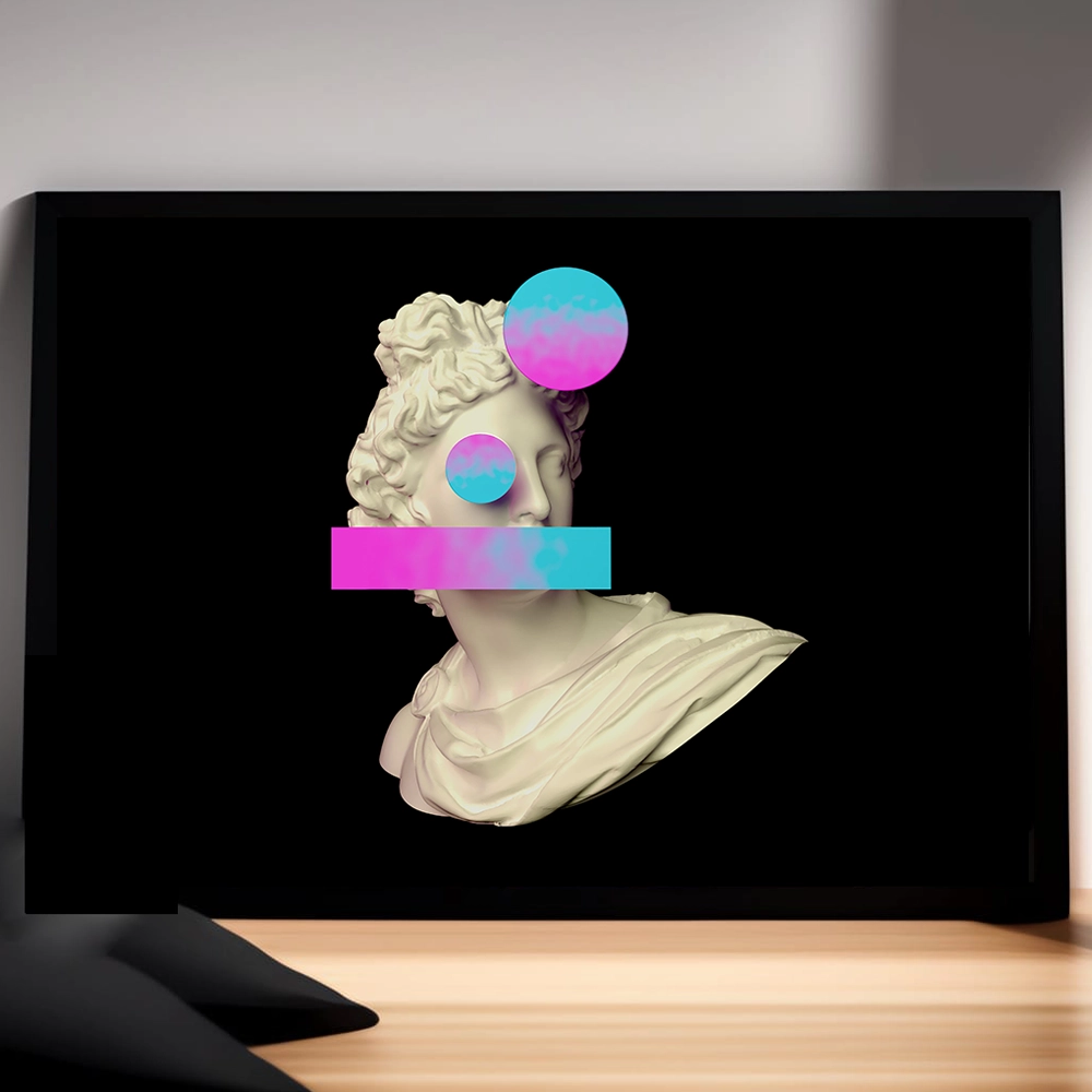 Elevate your space with Neo-Classical Glitch, a stunning fusion of timeless sculpture and digital minimalism. This artwork reimagines a classical bust with bold cyan-pink overlays on a deep black background — a seamless blend of heritage and hyper-modern expression. Printed on premium fine-art paper and finished in a sleek black frame, it transforms any wall into a statement of creativity and sophistication. Perfect for contemporary, minimalist, or eclectic interiors, this piece embodies both balance and boldness.
