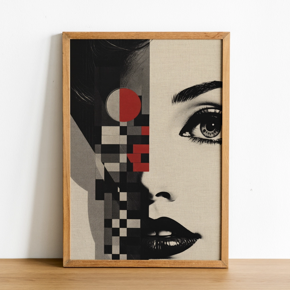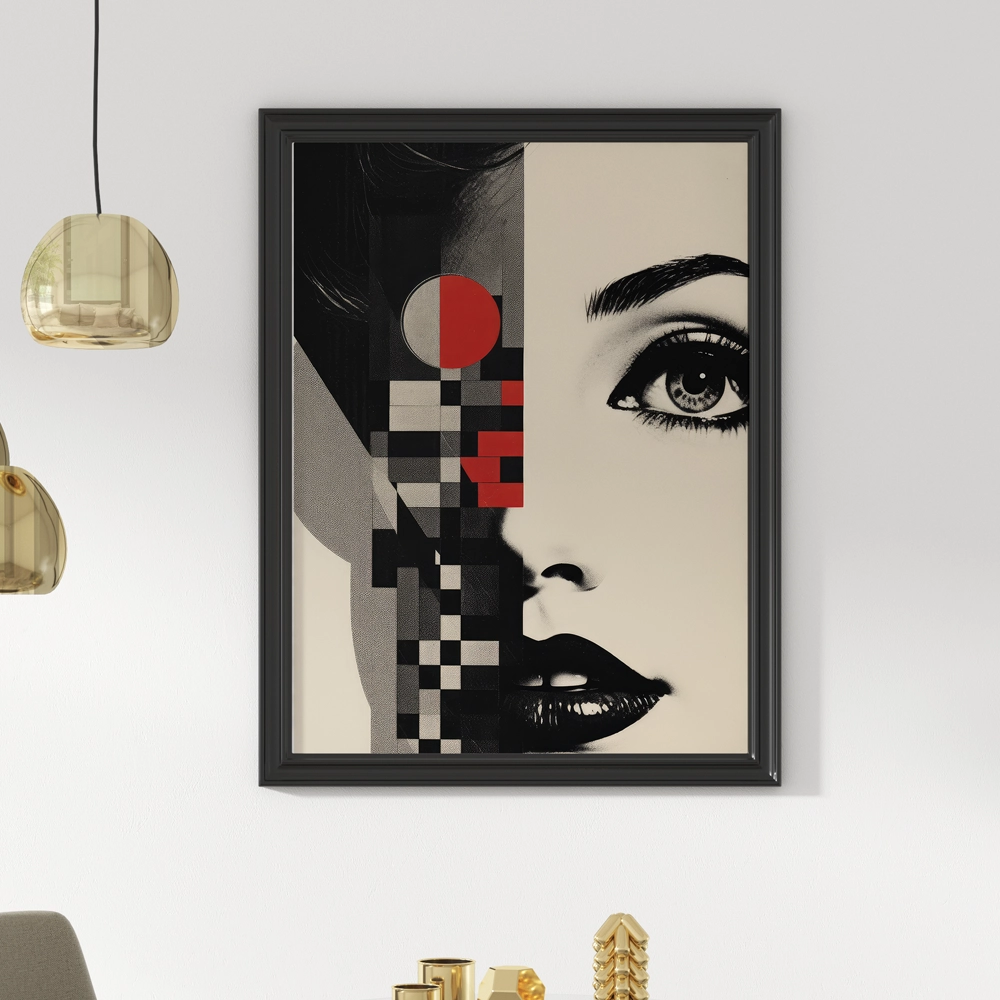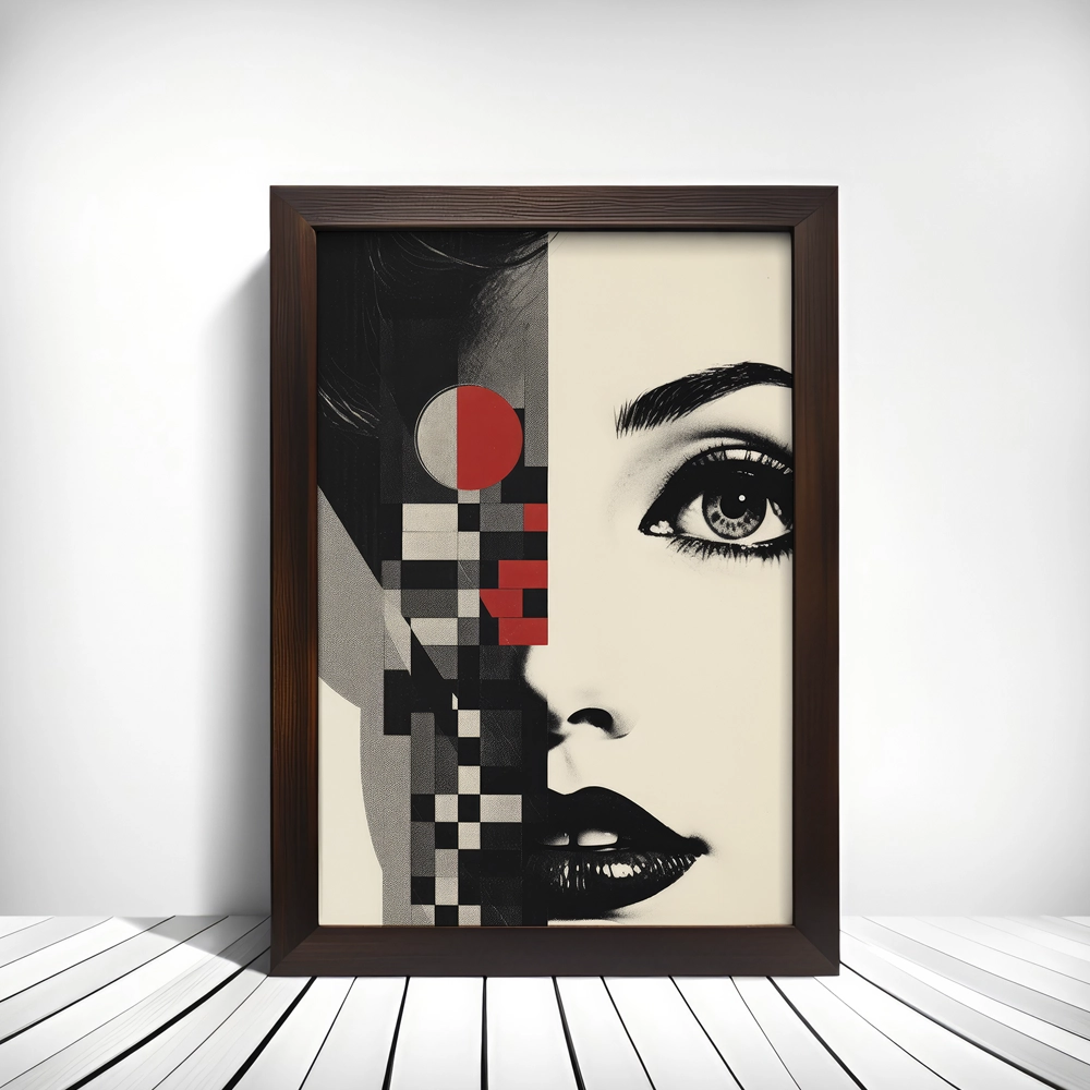 Redefine your walls with Pixel Muse, a captivating fusion of vintage glamour and digital abstraction. This monochrome portrait combines bold geometry, halftone textures, and a touch of vivid red to create a striking balance between emotion and structure. Printed on premium fine-art paper and set within a sleek black frame, this piece adds instant sophistication to any space. Ideal for modern interiors, art studios, or creative offices, Pixel Muse reflects individuality and avant-garde style in perfect harmony.