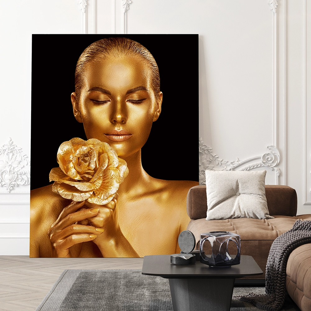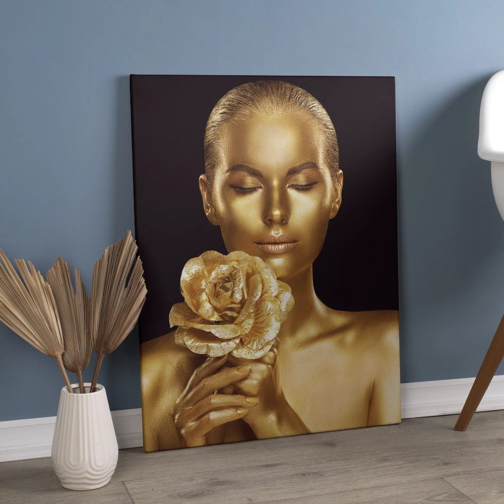 Elevate your space with the luxurious charm of the Golden Girl with Gold Rose Wall Art. This stunning canvas features a graceful female face adorned with a golden rose, blending elegance, modern artistry, and a touch of romance. Perfect for contemporary, minimalist, or luxury-inspired interiors, this piece becomes a captivating focal point that adds sophistication and personality to any room. Printed on premium-quality canvas with vibrant, fade-resistant inks, it delivers lasting beauty and artistic impact.
