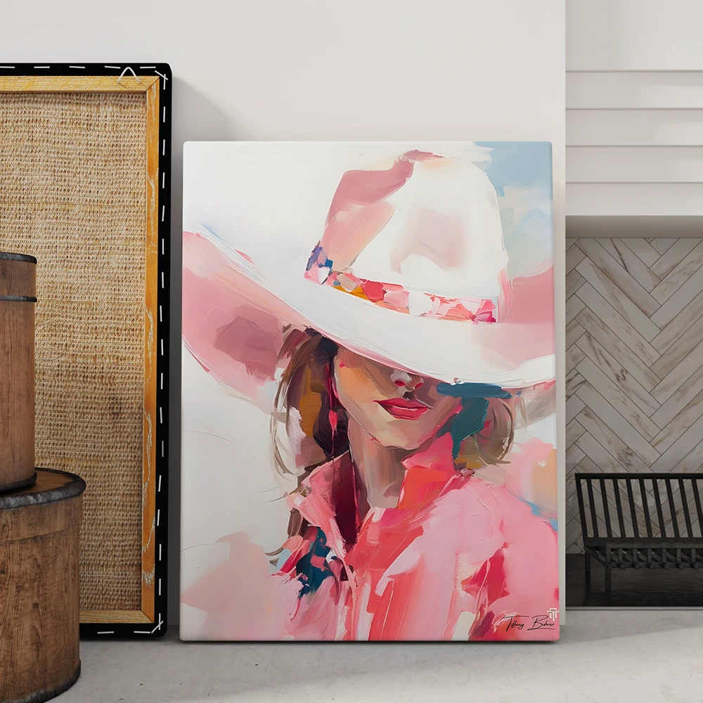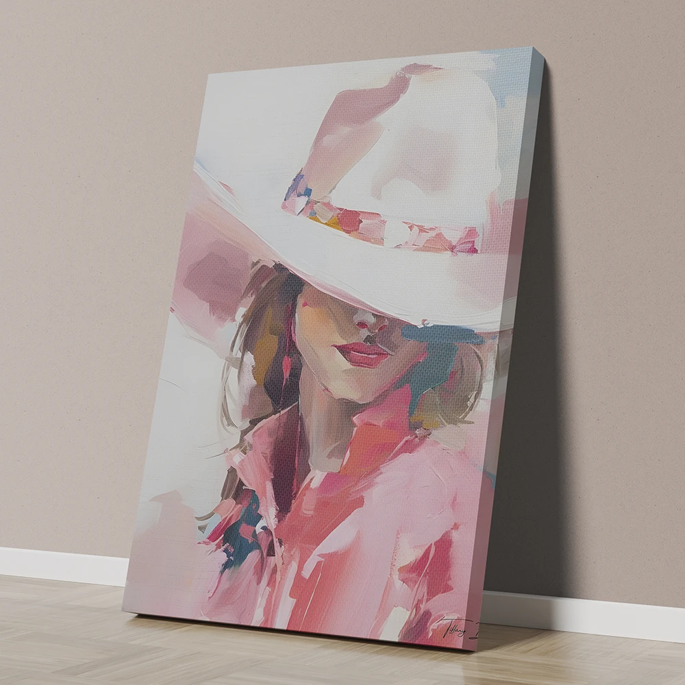 A delicate Pink Girl with Hat Canvas that radiates elegance, femininity, and modern charm.