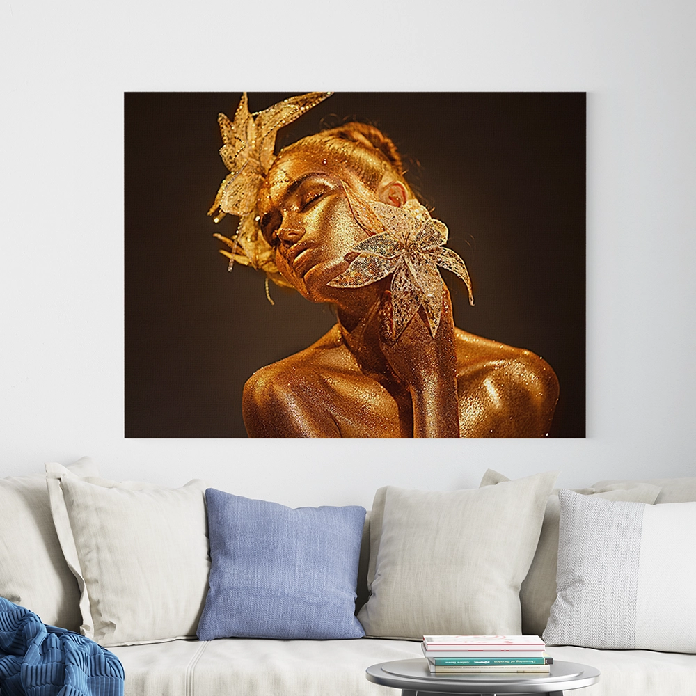 Illuminate your space with the Radiant Gold Colour Girl Face Wall Art. This captivating canvas features a graceful female face in shimmering golden tones, exuding elegance, sophistication, and modern artistic flair. Perfect for contemporary, minimalist, or luxury-inspired interiors, this piece serves as a striking focal point that adds warmth, personality, and style to any room. Printed on premium-quality canvas with vibrant, fade-resistant inks, it guarantees long-lasting beauty and visual impact.