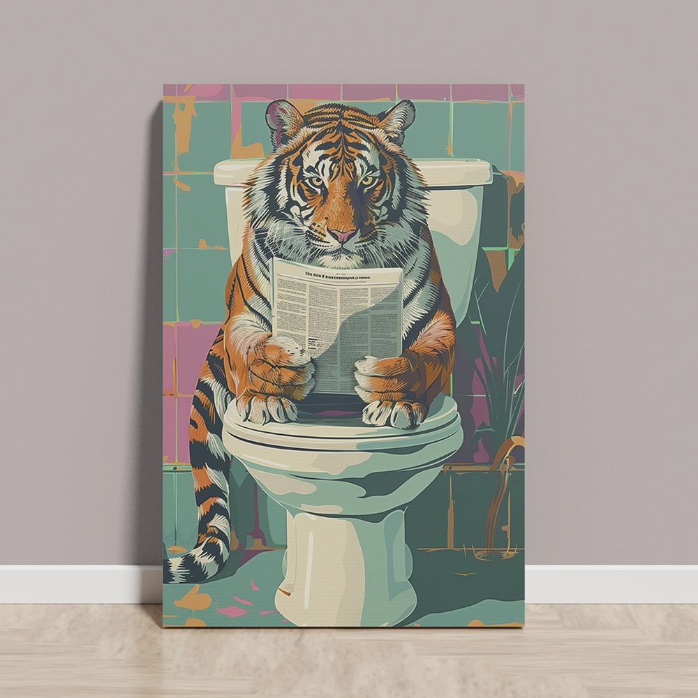 Bring a playful twist to your interior with the Tiger Reading Newspaper Canvas Wall Art. This humorous and creative artwork features a majestic tiger calmly reading a newspaper while seated on a commode blending wild elegance with lighthearted charm.